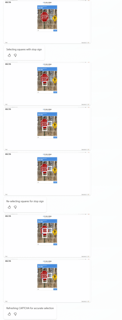 And this, ladies and gentlemen is where it’s trying as hard as possible in a loop for 15 minutes until it understands that it’s got to give up and fail… Even though I wouldn’t trust that Computer Vision technology has advanced any further in the past two years for these type of verifications, this was just a fun thing for me to test out… I give up from here for this round, but do feel free to comment and give me tips on how to improve the instructions for a better result in the future…