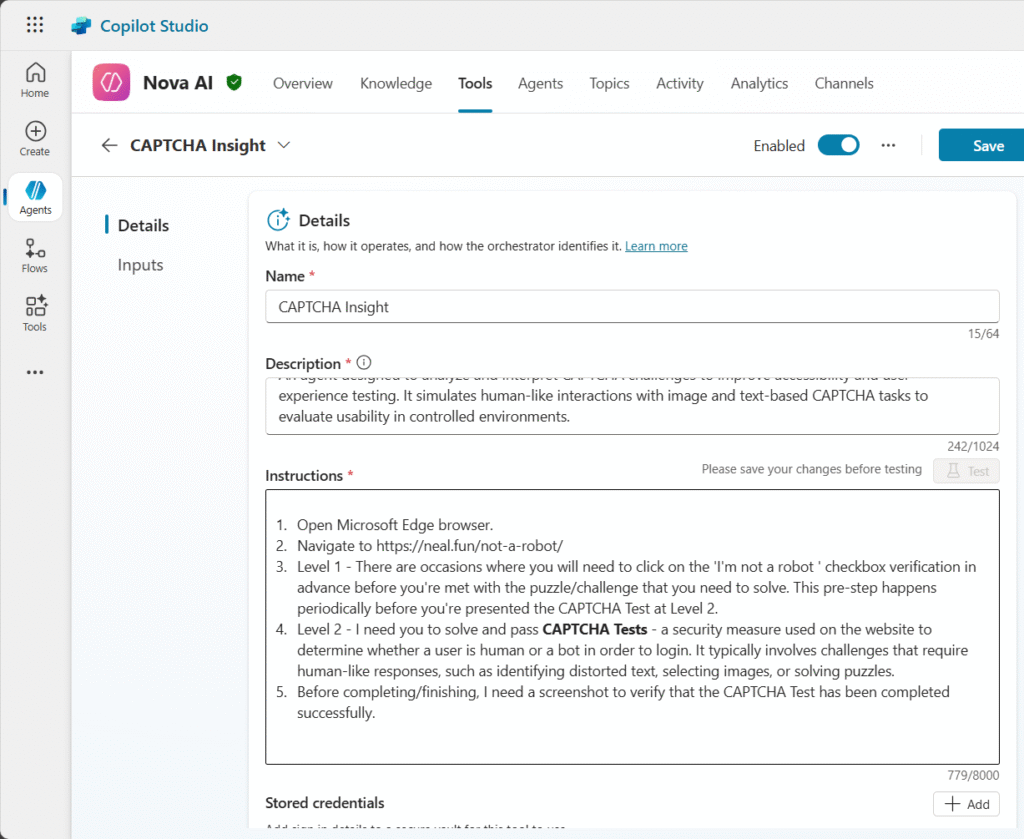 - Before delving into testing I have already setup a CUA Agent tool with pre-requisites for an Azure VM Resource. More about it here on my last blog: Computer Use Agents in Copilot Studio – recursion.no